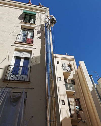 En el apartado de instalaciones tenemos la inestimable colaboración de nuestros profesionales de trabajos verticales, para el montaje y la instalación de tubos de doble capa EI30 para salidas de humos de restaurantes, bares y de mas comercios, que necesiten la instalación profesional de salidas de humos o chimeneas. Ejecutando trabajos al mas alto nivel con unos presupuestos ajustados a la economía actual de nuestro país, pero contando con la mayor de las garantías en su proyecto y ejecución. Pídanos presupuesto sin compromiso ninguno.